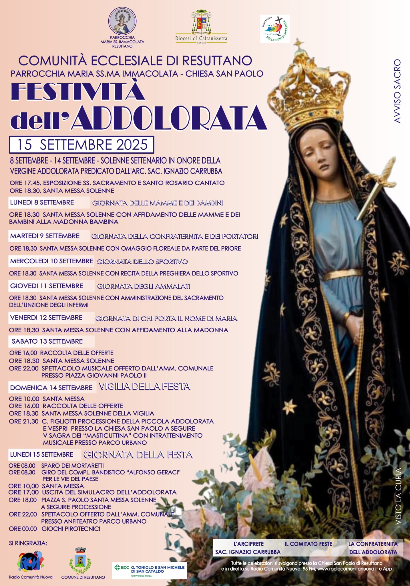 La comunità ecclesiale di Resuttano si prepara a vivere con intensa partecipazione la Festa dell’Addolorata, in programma dal 8 al 15 settembre 2025 presso la Chiesa San Paolo. Un appuntamento che, anno dopo anno, testimonia la profonda e duratura devozione dei resuttanesi verso la Vergine Addolorata, madre di dolore e di speranza, capace di accogliere le nostre ansie e le nostre tribolazioni.