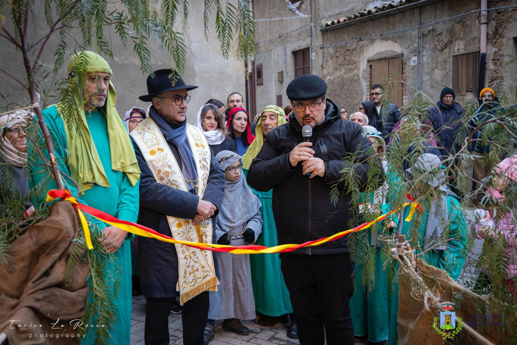 Alle spalle delle autorità, una folta folla di curiosi e devoti ha atteso pazientemente il proprio turno per poter ammirare la suggestiva rappresentazione della Natività, resa ancor più emozionante dal fascino senza tempo delle stradine del centro storico. La visita attraverso i vicoli illuminati da torce e lanterne offre agli ospiti un vero e proprio viaggio nel passato, con scene di vita quotidiana riproposte da figuranti in abiti d’epoca, mestieri artigianali riprodotti fedelmente e assaggi di prodotti tipici della tradizione locale.